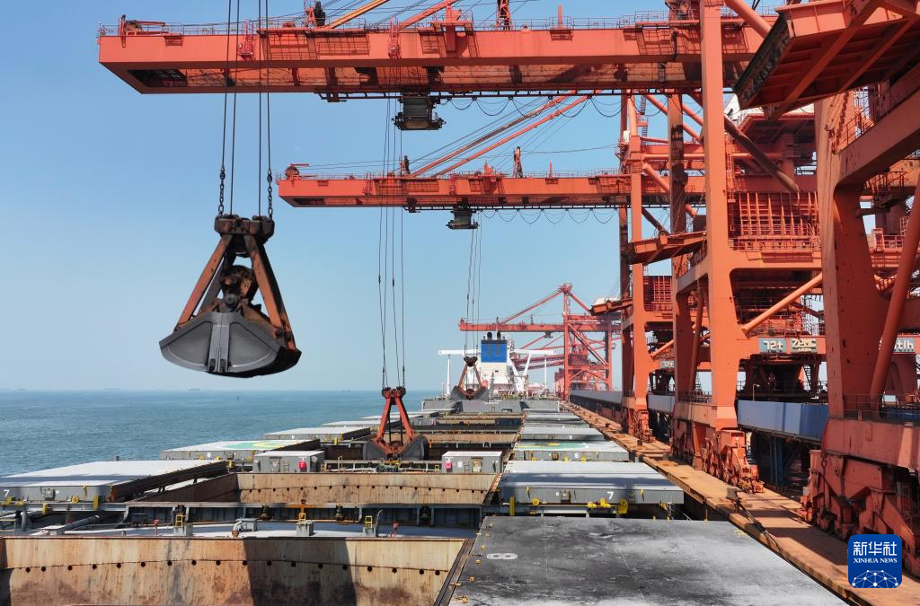 7月18日,一艘轮船靠泊在唐山港曹妃甸港区矿石码头卸载矿物(无人机照片)。