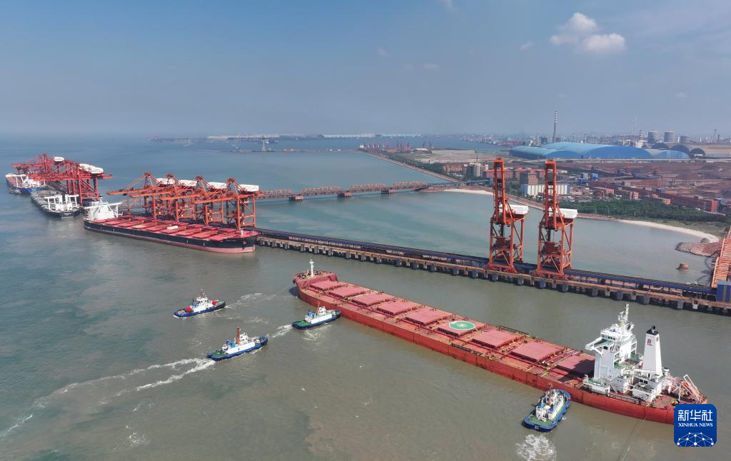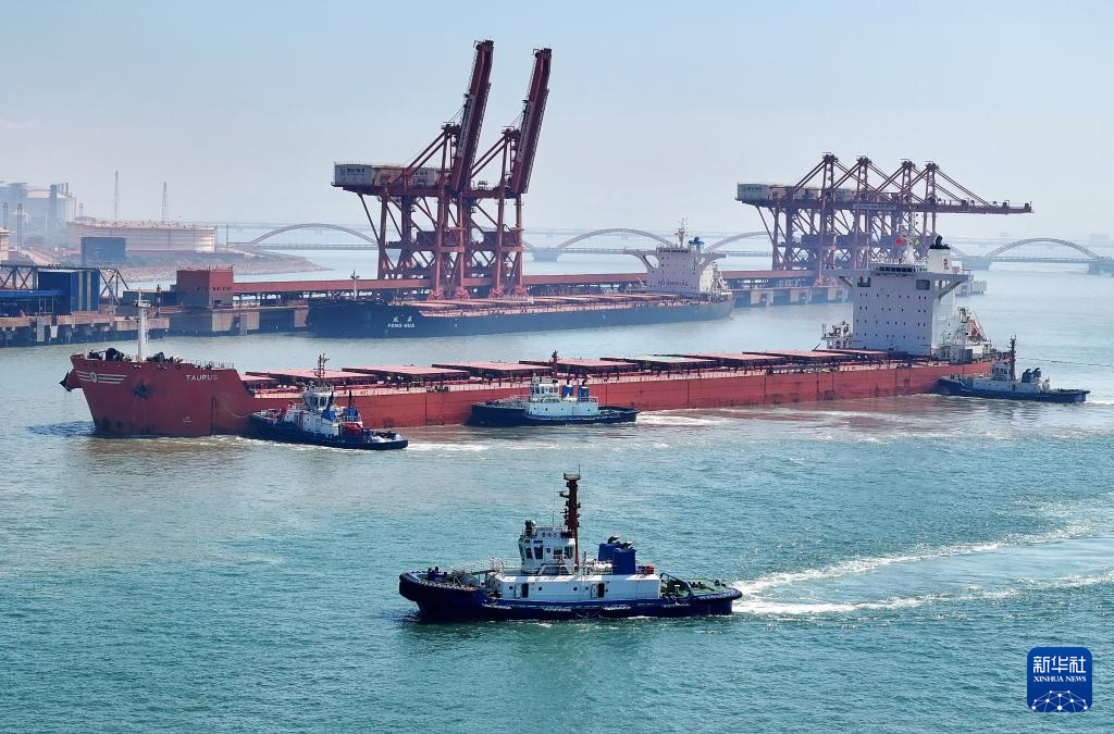 7月18日,轮船在拖轮的协助下向唐山港曹妃甸港区矿石码头靠泊(无人机照片)。
