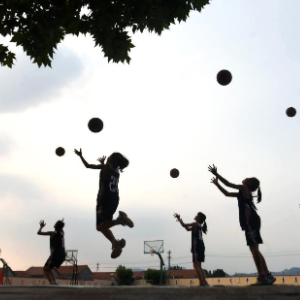 7月19日,孩子们在湖南省永州市道县一家体育培训机构参加篮球训练。