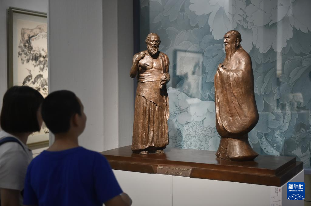7月19日,观众在中国美术馆参观展出的吴为山作品《神遇——孔子与苏格拉底的对话》。