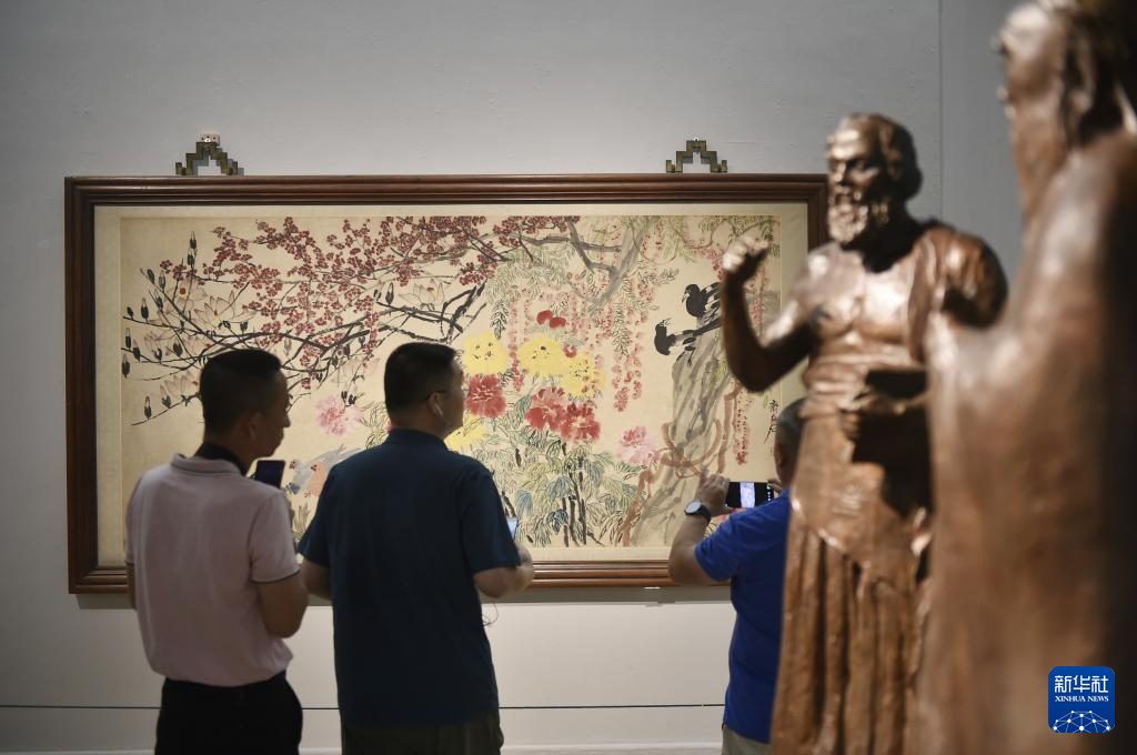 7月19日,观众在中国美术馆参观展出的齐白石作品《百花与和平鸽》。