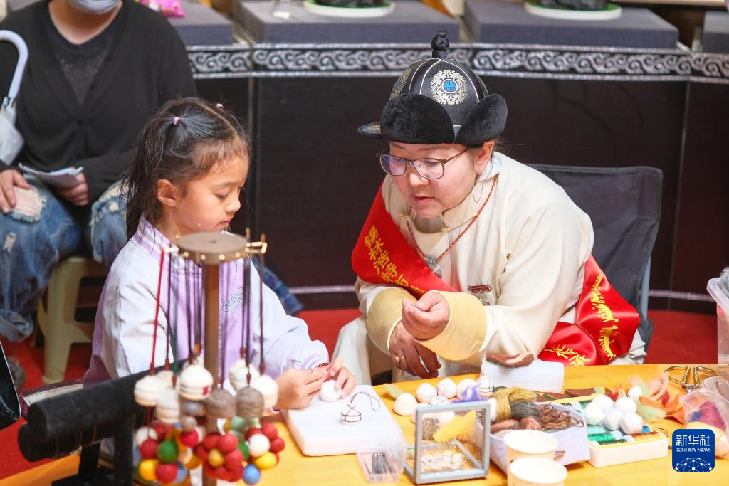 7月19日,在锡林郭勒那达慕风情园,小朋友在那达慕现场体验蒙古族传统毛毡制作。