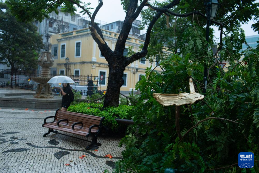 7月20日,行人经过澳门新马路一棵被风刮倒的树木。