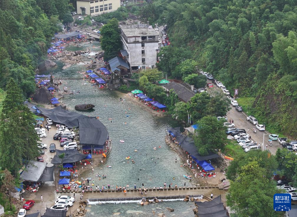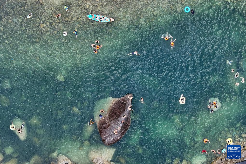 游客在融水苗族自治县香粉乡雨卜村戏水消暑(7月19日摄,无人机照片)。