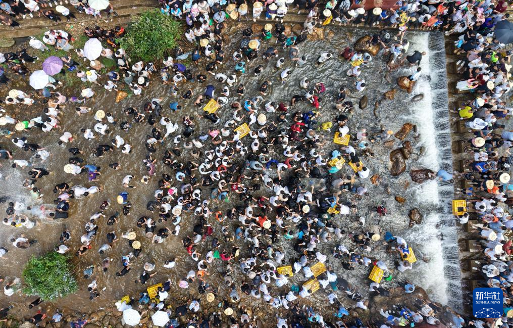 在融水苗族自治县红水乡良双村闹鱼节活动中,村民和游客在河里抓鱼(7月10日摄,无人机照片)。