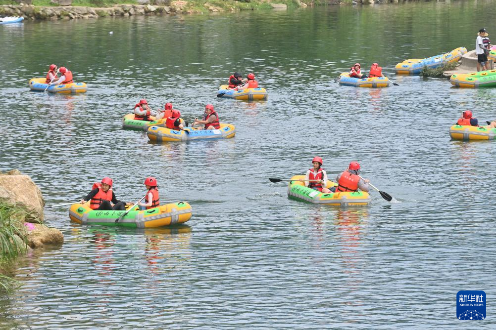 游客在融水苗族自治县香粉乡雨卜村漂流消暑(7月20日摄)。