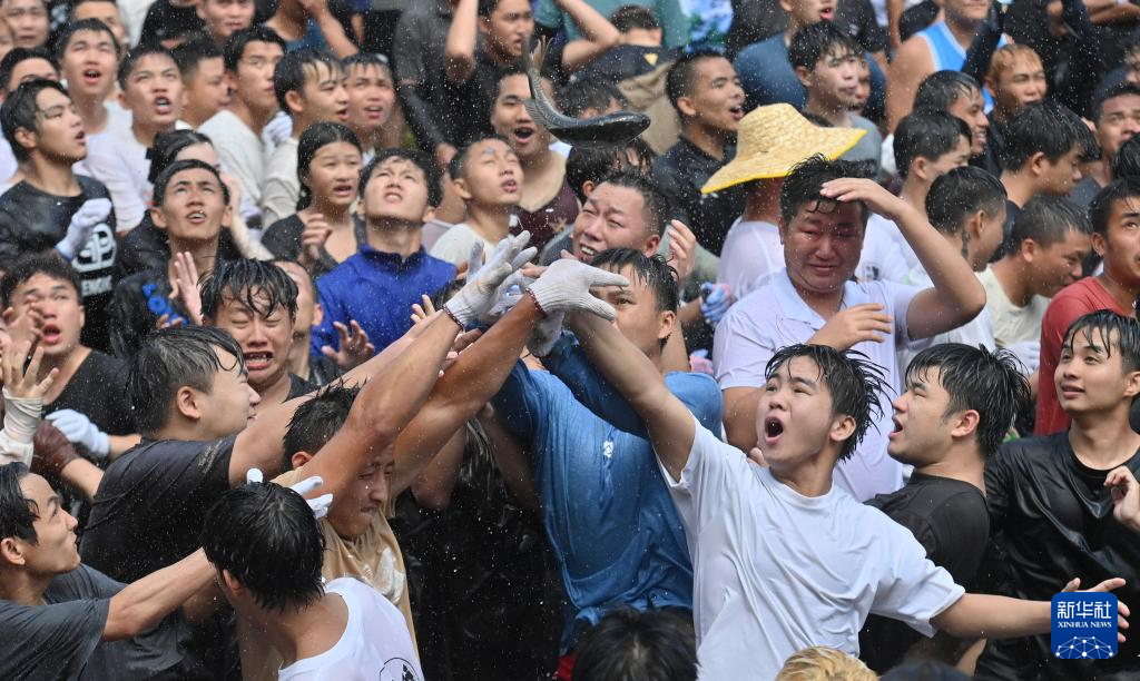 在融水苗族自治县红水乡良双村闹鱼节活动中,村民和游客在河里抓鱼(7月10日摄)。