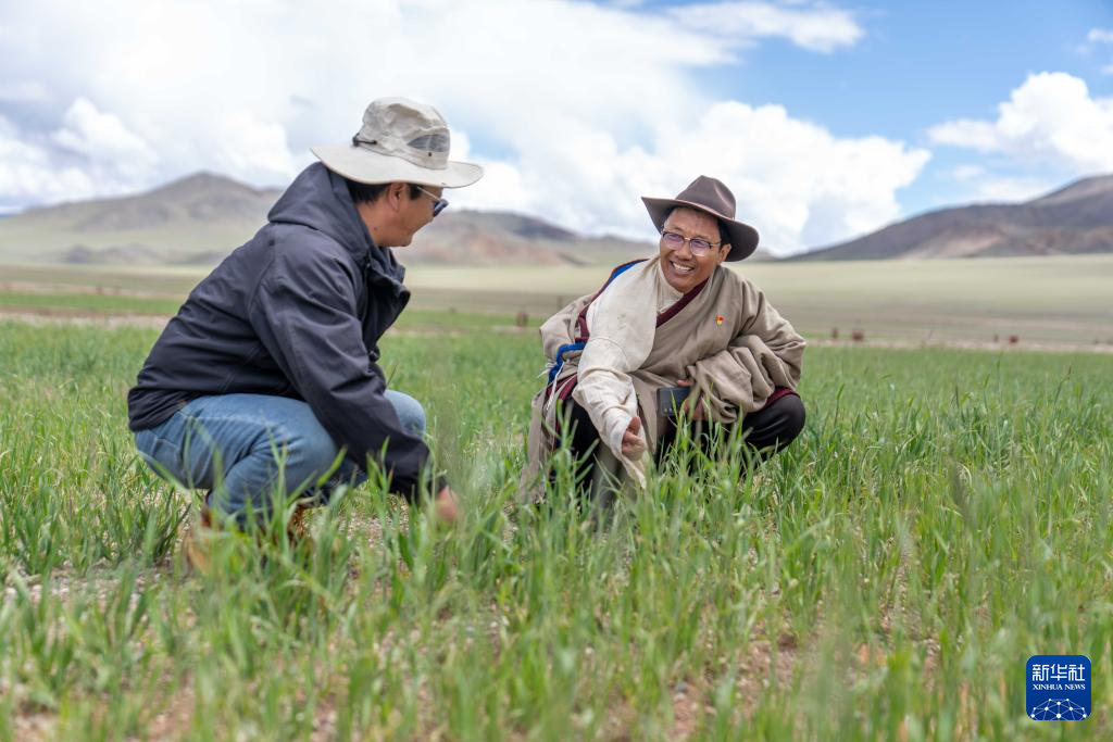 7月20日,文布当桑乡乡长拉巴欧珠(左)和夏玛村党支部书记努桑在看草的长势。