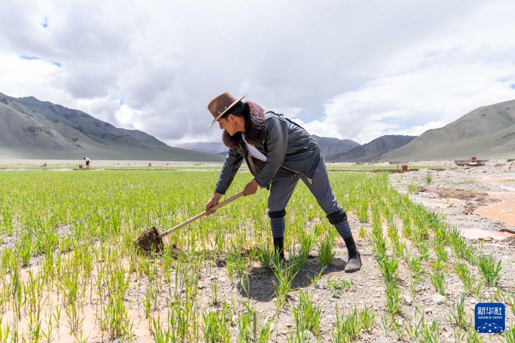 7月20日,西藏阿里地区革吉县文布当桑乡夏玛村村民嘎玛旺堆在人工种草基地工作。