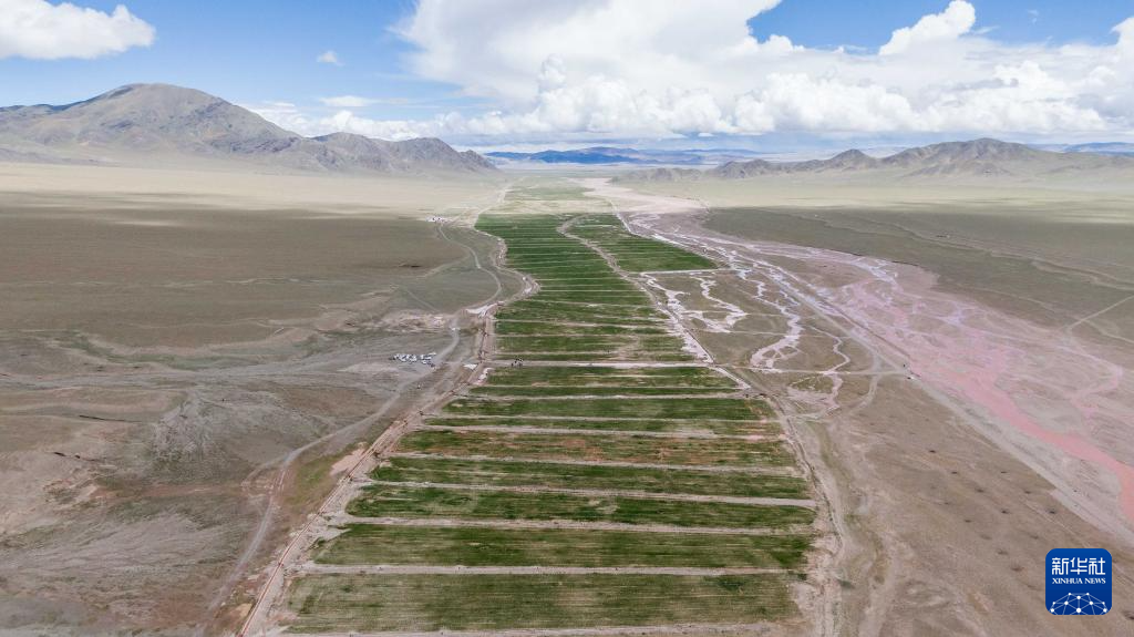 西藏阿里地区革吉县文布当桑乡人工种草基地一景(7月20日摄,无人机照片)。