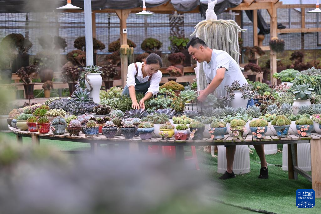 7月19日,在周宁静宇园艺有限公司多肉种植大棚,刘林(左)与丈夫张云昌共同打理多肉盆栽。