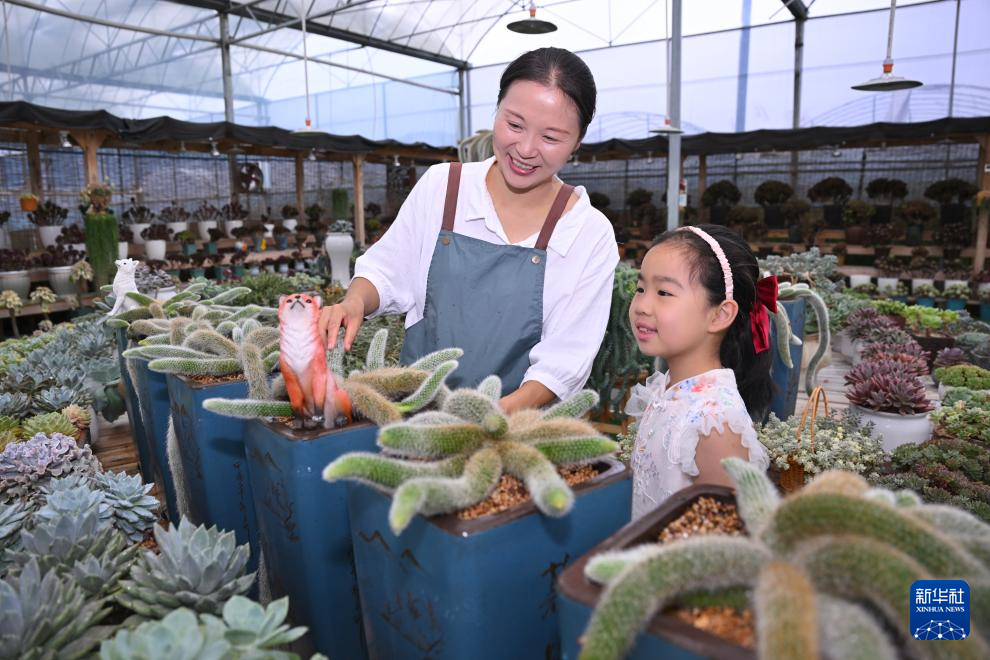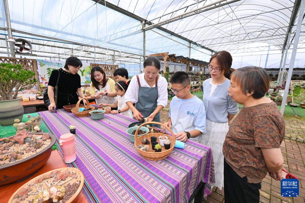 7月19日,在周宁静宇园艺有限公司多肉种植大棚,刘林(左)在向小游客介绍多肉创意盆栽。