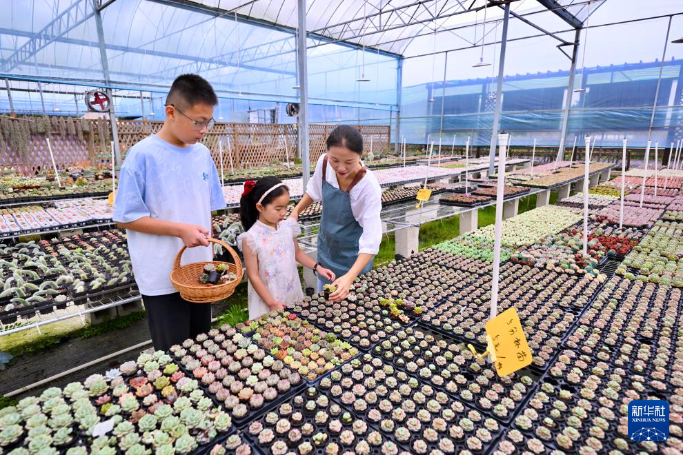 7月19日,在周宁静宇园艺有限公司多肉育种大棚,刘林(右一)带领小朋友挑选多肉苗。