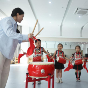 7月21日,在浙江省湖州市德清县乾元镇恒星幼儿园,上暑托班的孩子们在老师指导下练习打腰鼓。