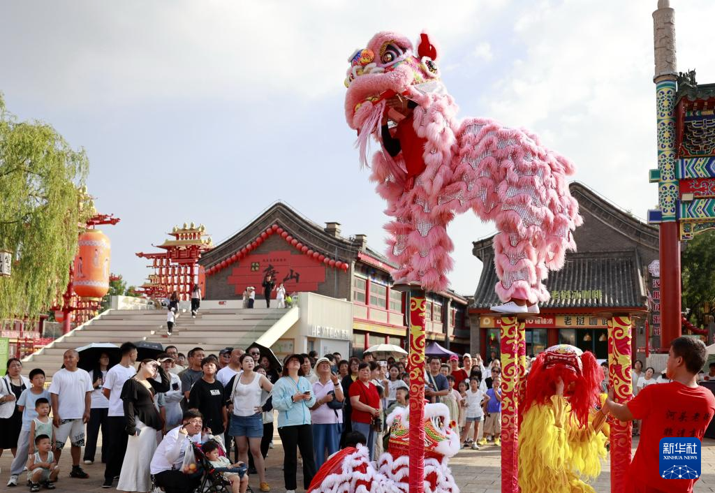 7月21日,游客在河北省唐山市丰南区河头老街景区欣赏狮舞表演。