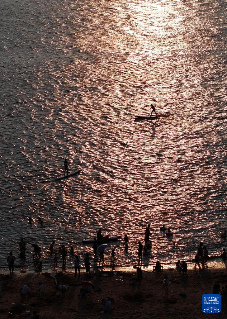 市民和游客在防城港市西湾旅游景区沙滩浴场游玩(7月6日摄)。