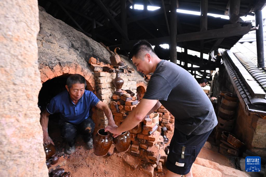 7月18日,在周宁县浦源镇萌源村月山古龙窑,肖家涨(左)与儿子肖永灿从龙窑内取成品硋器。