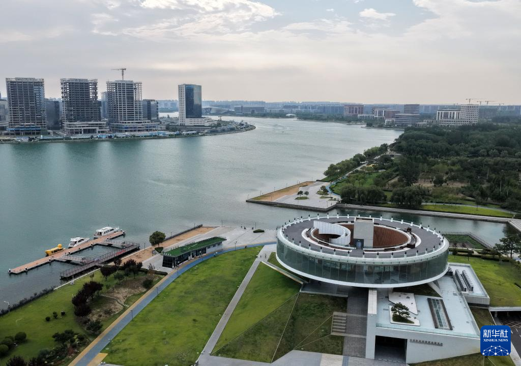 这是7月16日拍摄的郑州市北龙湖湿地公园一隅(无人机照片)。