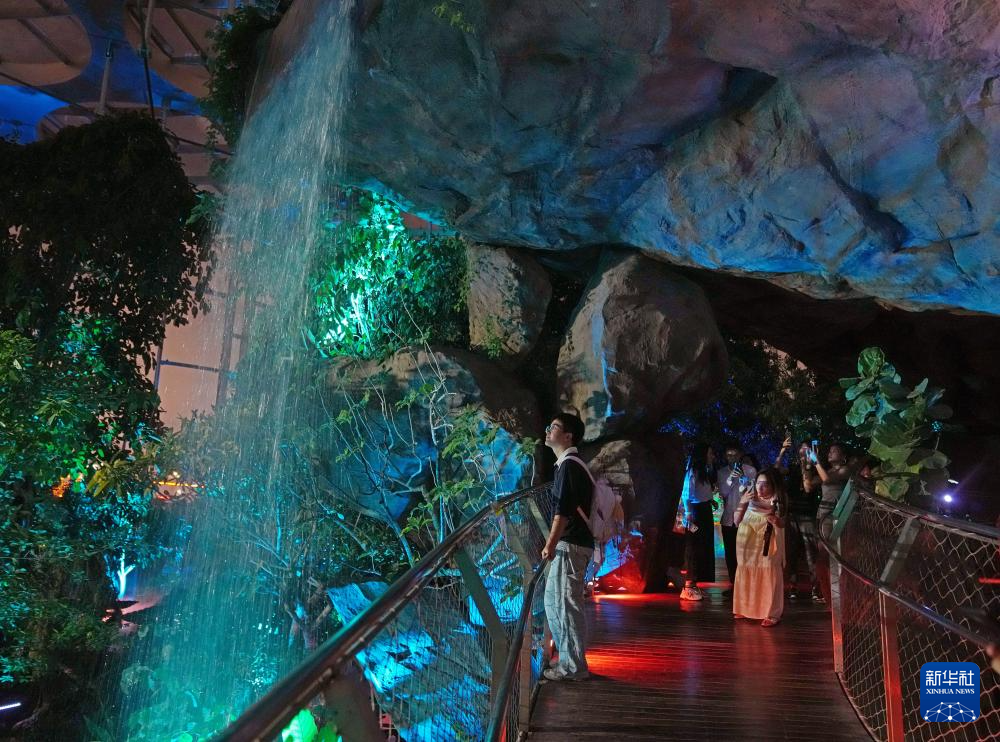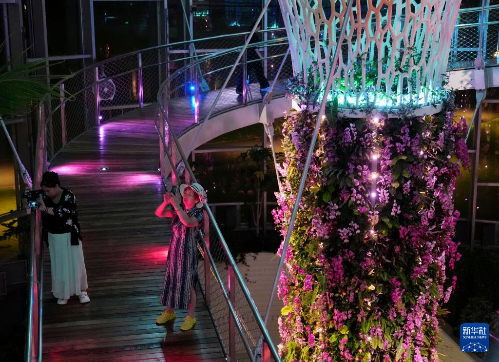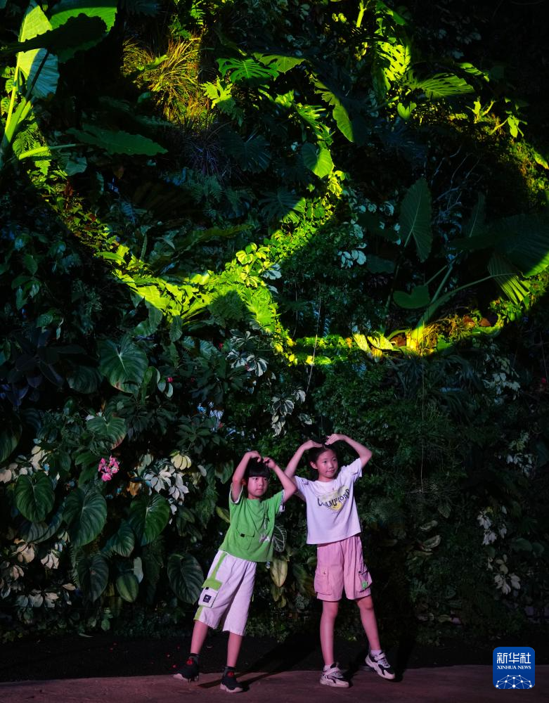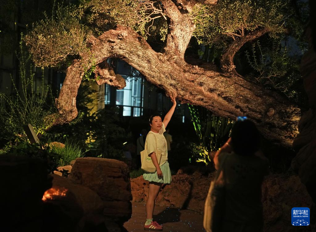 7月21日晚,夜游温室花园(测试场)的游客在拍照。