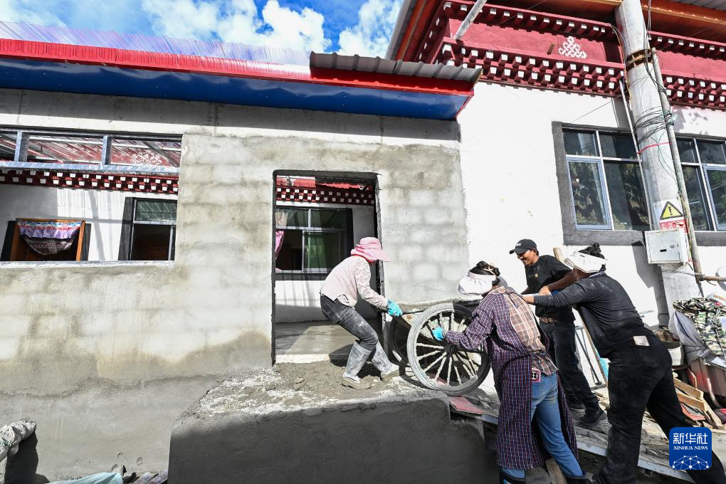7月21日,51岁的拉丁雪村村民次旺罗布(右二)在村民的帮助下运输建筑材料,改造提升自己的房屋。