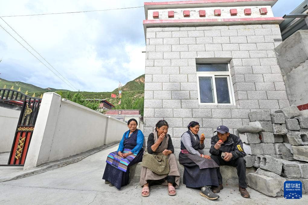 7月21日,村民在拉丁雪村一处还在改造提升中的农房前聊天、吃水果。