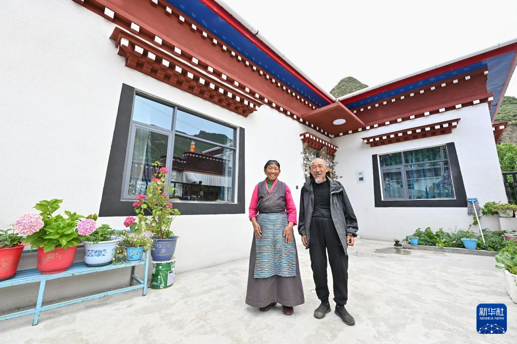 7月21日,拉丁雪村74岁的扎西欧珠(右)和73岁的老伴索朗玉珍站在自家的新房前合影。