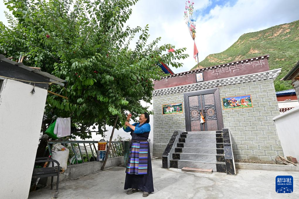 7月21日,63岁的拉丁雪村村民索朗康珠在改造提升后的自家小院内摘李子。