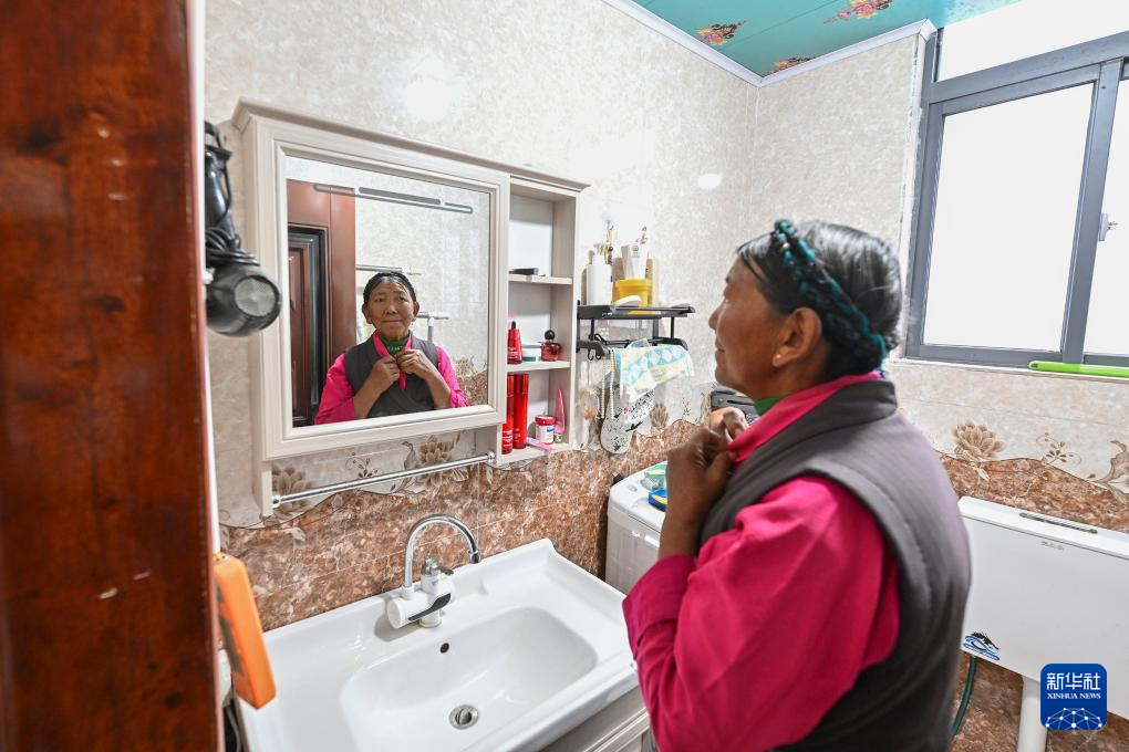 7月21日,73岁的拉丁雪村村民索朗玉珍在新房卫生间内整理衣服。