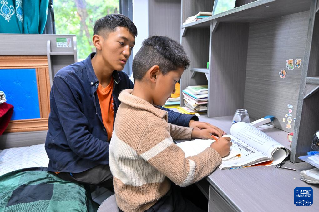 7月21日,17岁的米玛次仁(左)在新房卧室内辅导7岁的弟弟坚阿达瓦写作业。