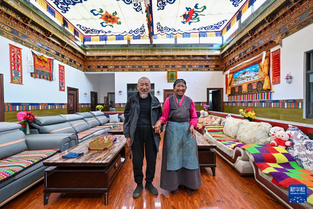 7月21日,拉丁雪村74岁的扎西欧珠(左)和73岁的老伴索朗玉珍站在自家新房的客厅里合影。