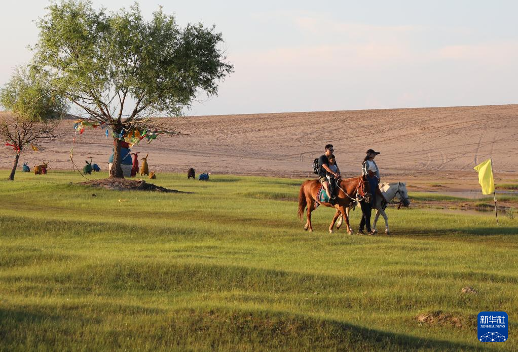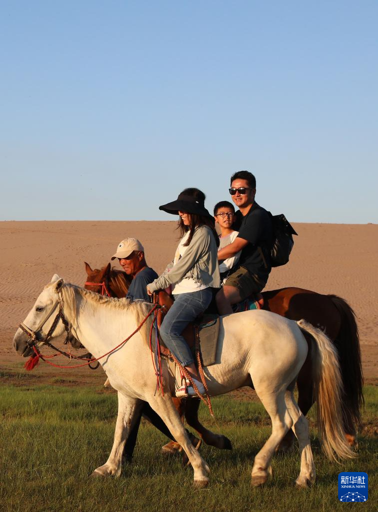 7月21日,来自四川的游客在内蒙古自治区赤峰市巴林右旗大板镇翁根毛都嘎查境内的沙地草原骑马。