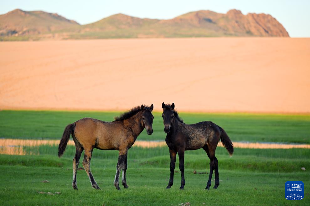 7月21日在内蒙古自治区赤峰市巴林右旗大板镇翁根毛都嘎查境内的沙地草原拍摄的两匹马驹。
