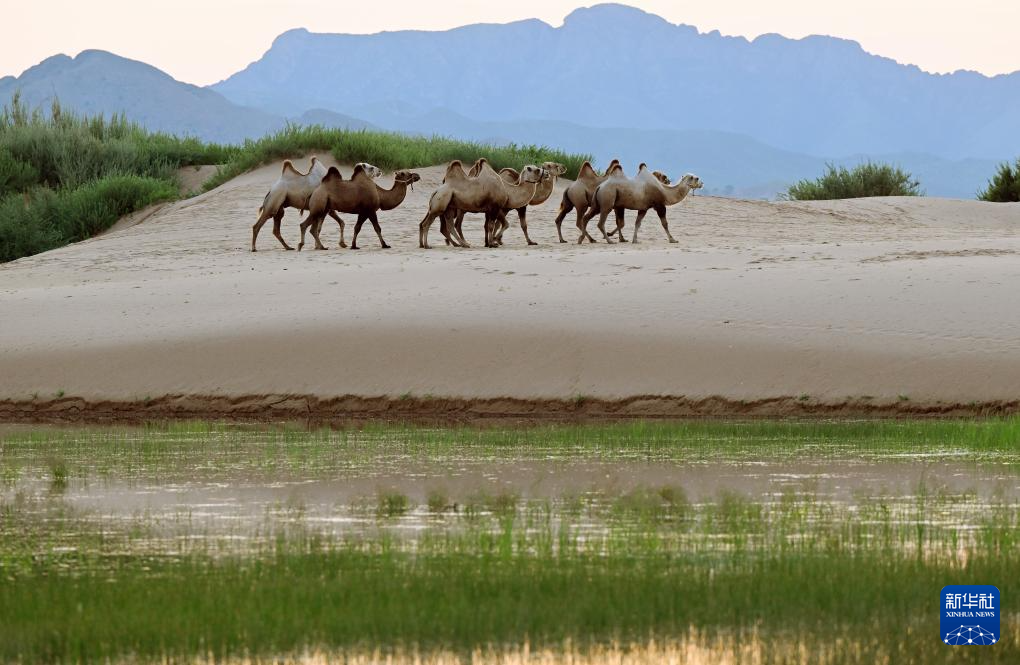 7月21日,驼群在内蒙古自治区赤峰市巴林右旗大板镇翁根毛都嘎查境内的沙地草原漫步。