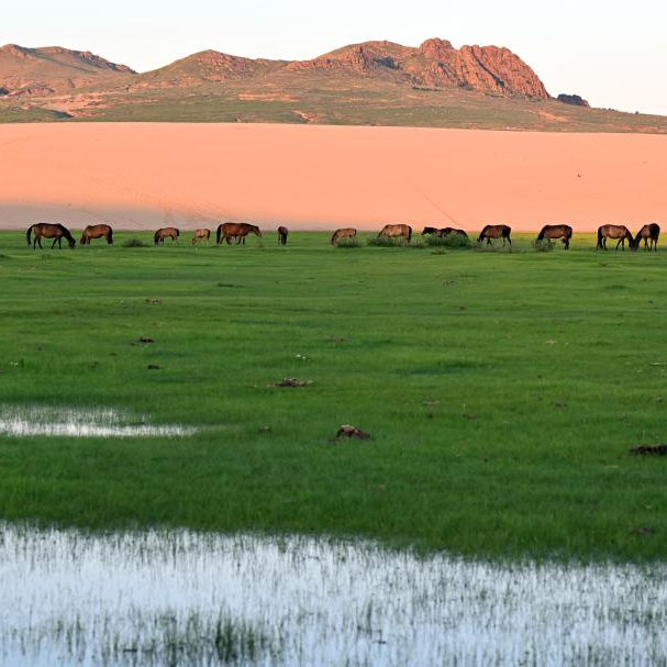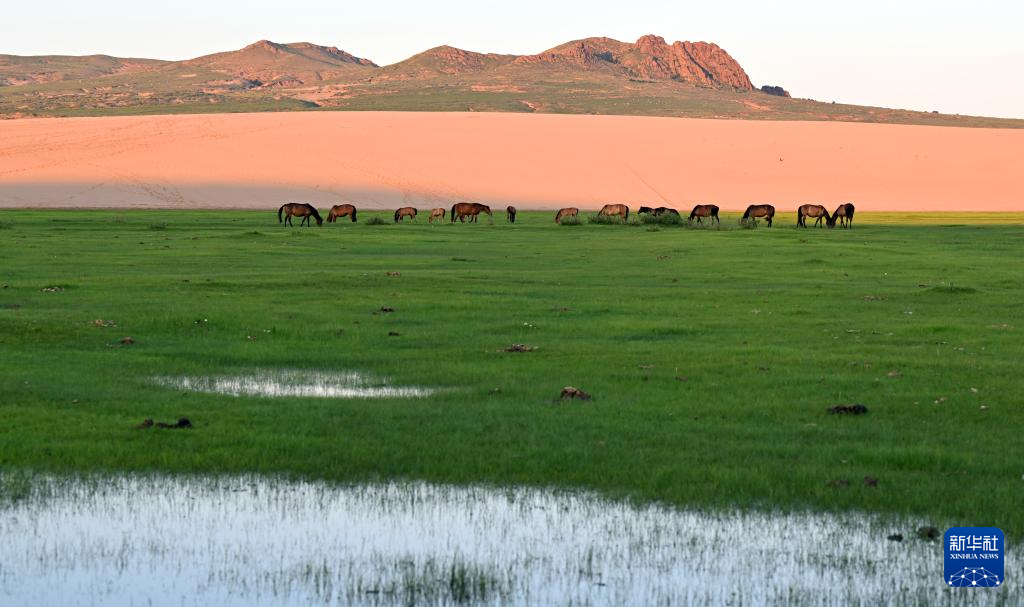 7月21日,马群在内蒙古自治区赤峰市巴林右旗大板镇翁根毛都嘎查境内的沙地草原吃草。