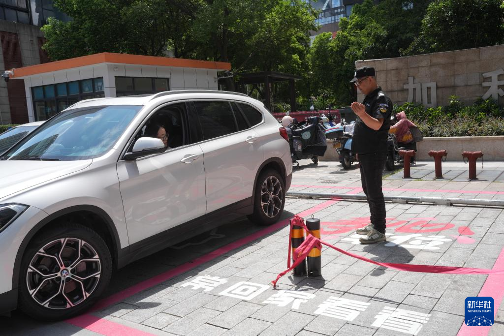 7月23日,在湖州市中心的利民社区,保安指导居民停入孝心车位。孝心车位可为前来看望老人的子女提供2.5小时免费停车服务。