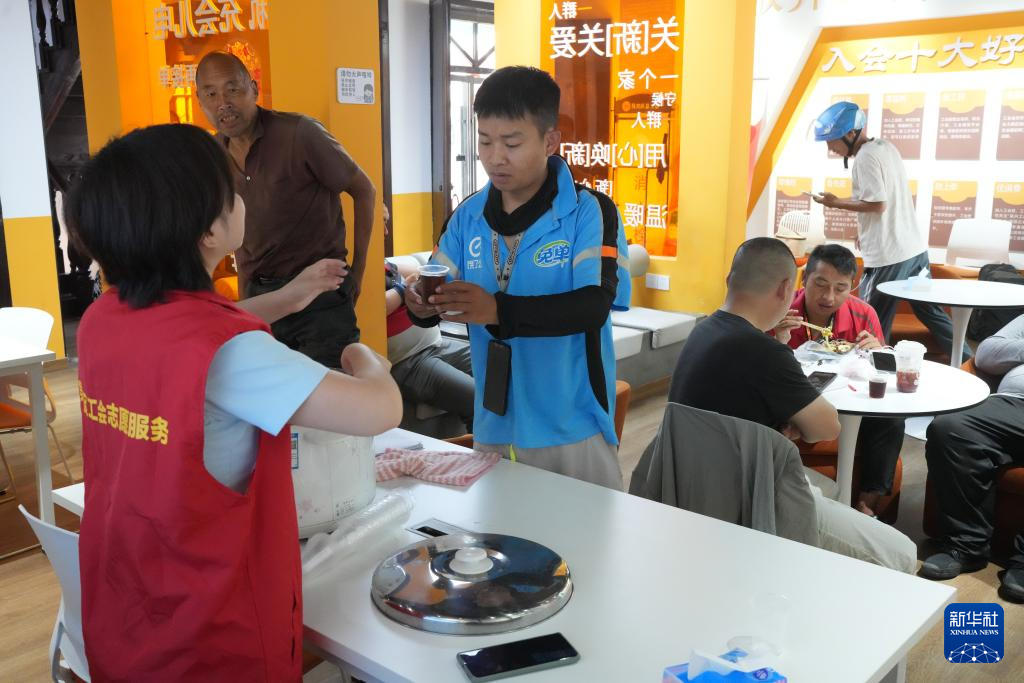 7月23日,在湖州市衣裳街,工作人员在吴兴区总工会和爱山街道打造的驿站为外卖员提供服务。