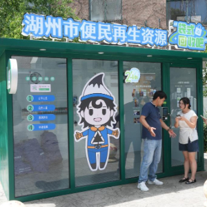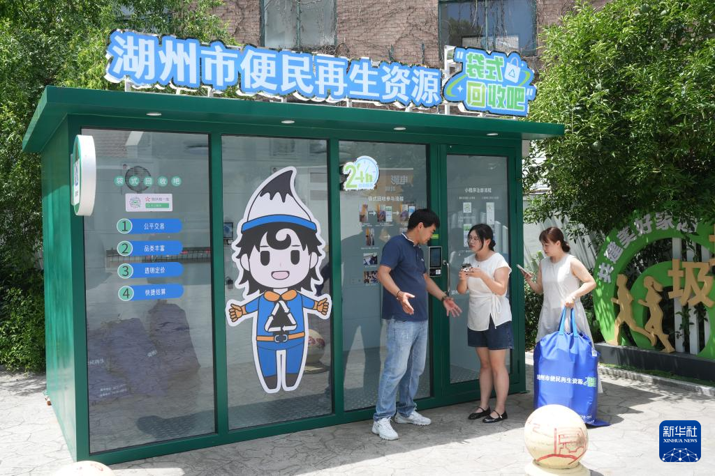 7月23日,在湖州市中心的红丰西塘社区,工作人员(左)指导居民利用袋式回收吧进行垃圾分类管理。