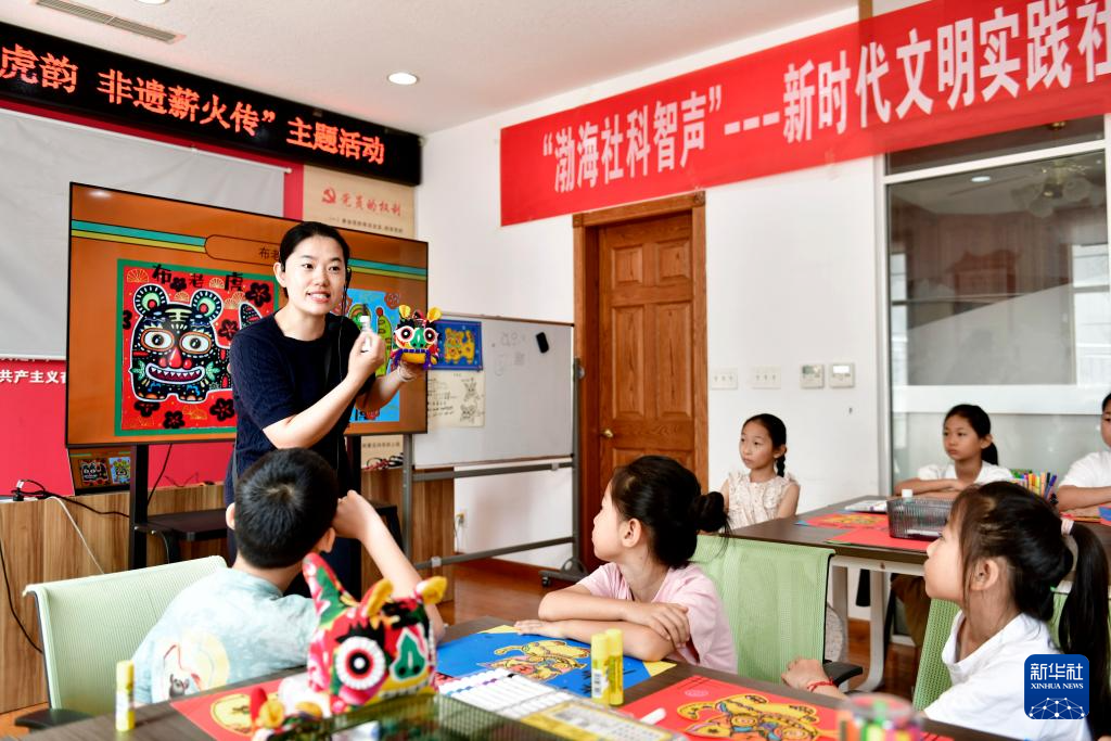 7月23日,在博兴县城东街道御华社区“滨滨学堂”,志愿者屈虹虹向孩子讲授布老虎及贴画制作。
