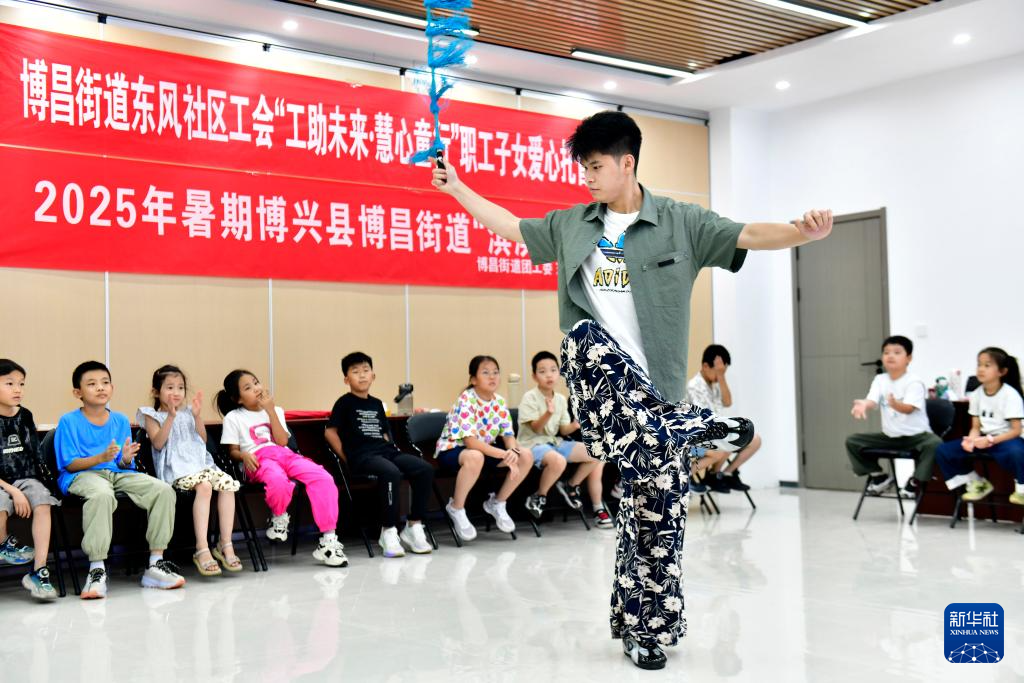 7月23日,在博兴县博昌街道东风社区“滨滨学堂”,来自中国戏曲学院的博兴籍大学生周熠翔为孩子表演戏剧功夫。