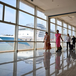 7月23日,旅客在天津国际邮轮母港准备办理登船手续。