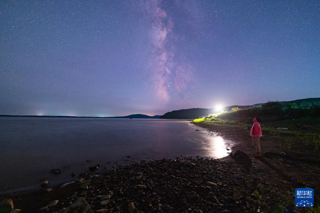 7月21日,哈尔滨西泉眼水库,星空摄影爱好者在观赏“银河垂立”景象。