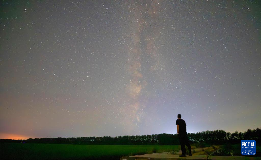 7月21日,黑龙江省富锦市长安镇,星空摄影爱好者在观赏“银河垂立”景象。