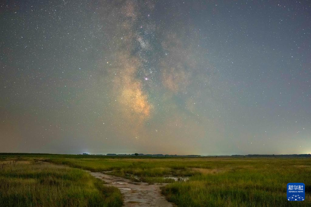 7月20日,星空摄影爱好者在黑龙江省齐齐哈尔市克钦湖湿地拍摄“银河垂立”景象。