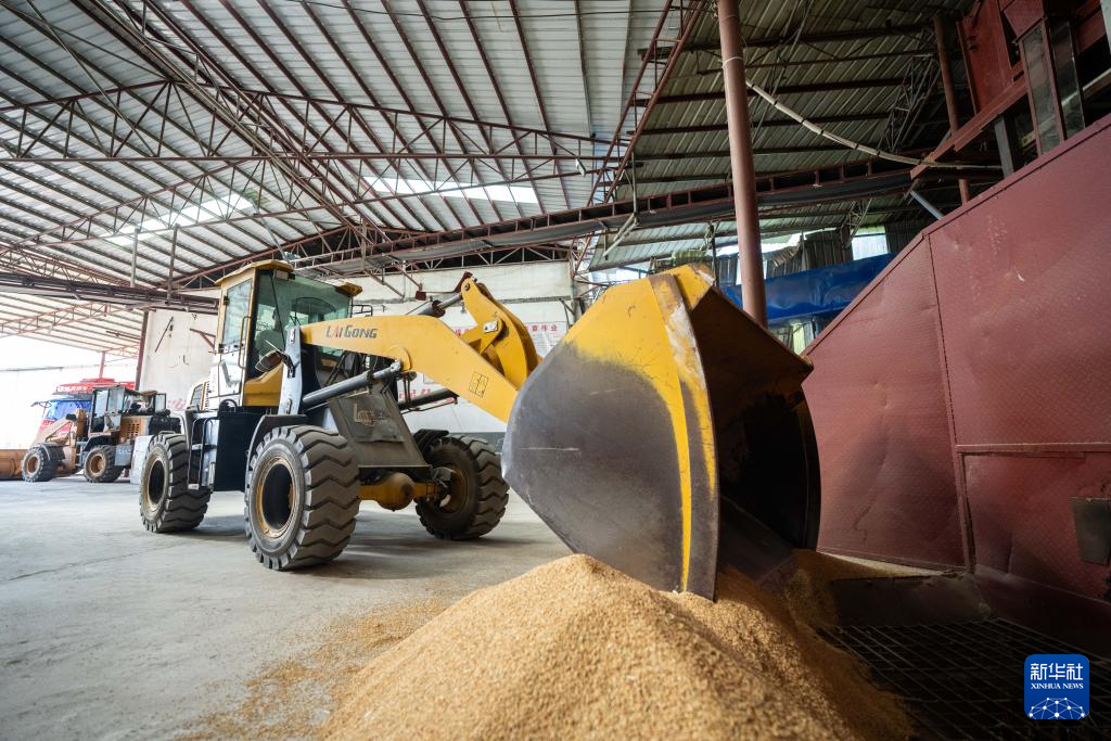 7月24日,在常德市鼎城区双桥坪镇一个水稻烘干工厂,工人驾驶铲车把稻谷放入烘干设备。