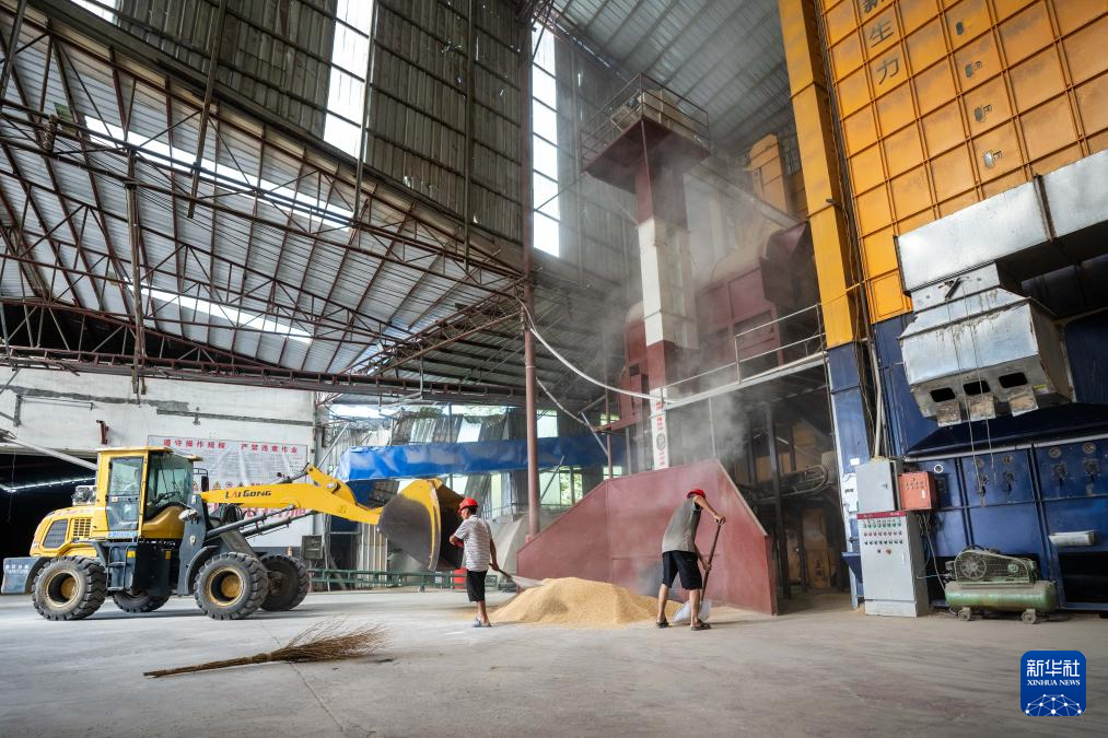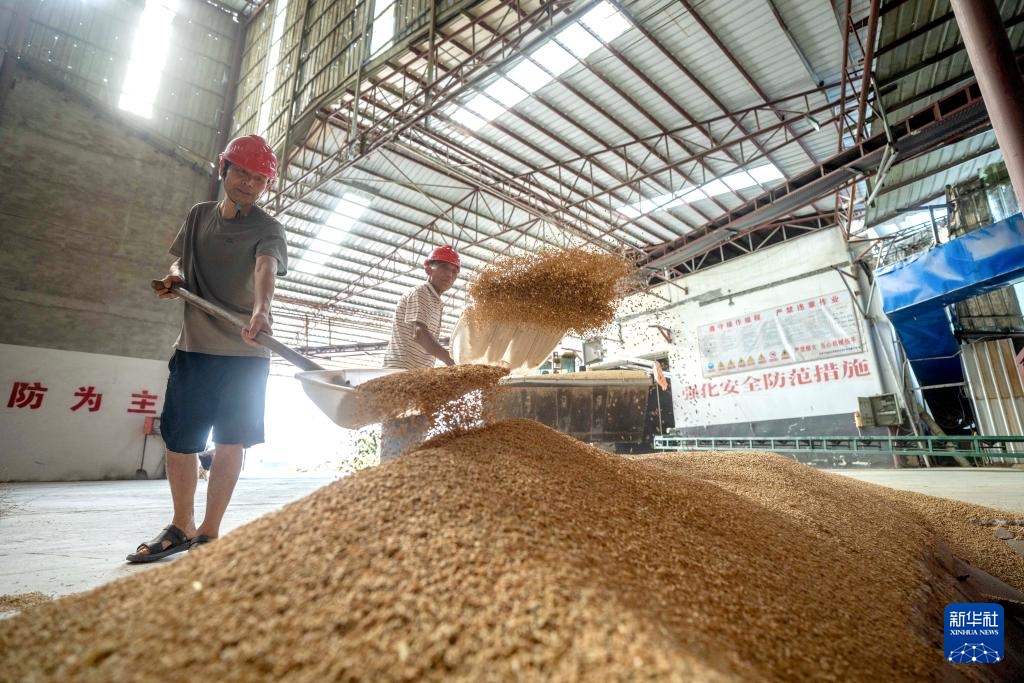 7月24日,在常德市鼎城区双桥坪镇一个水稻烘干工厂,工人把稻谷放入烘干设备。