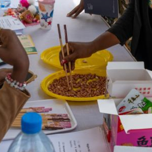 7月24日,在加蓬首都利伯维尔举行的中国-加蓬商品展览会上,当地顾客学习使用筷子。