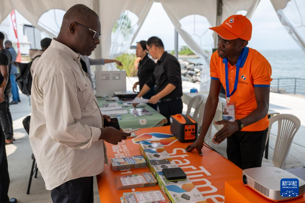 7月24日,在加蓬首都利伯维尔举行的中国-加蓬商品展览会上,当地顾客在中企四达时代的展台咨询产品。
