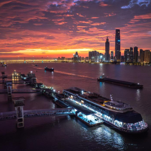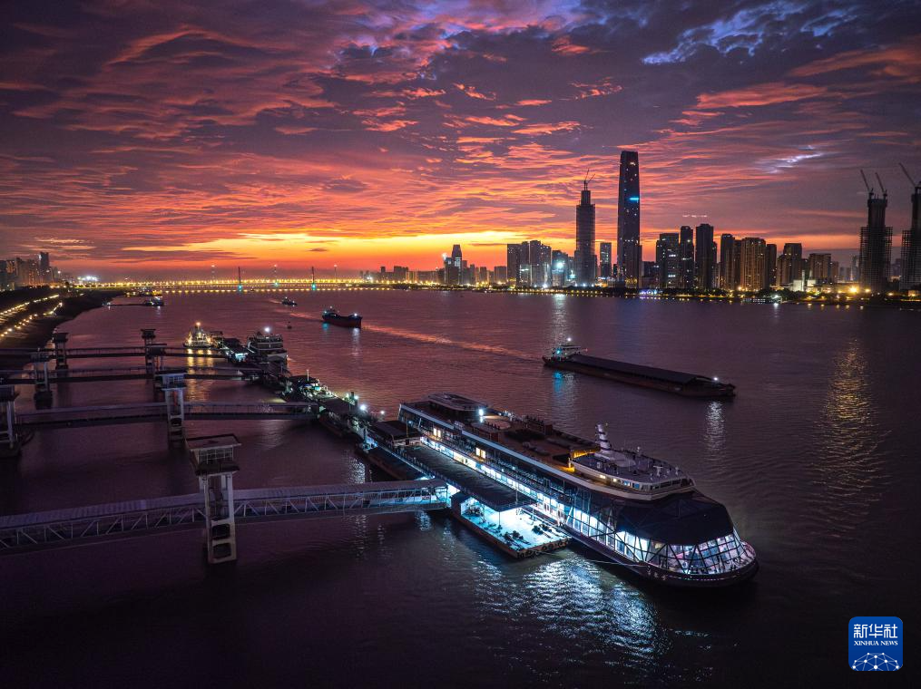 7月26日清晨,船舶伴着朝霞行驶在长江武汉江段(无人机照片)。