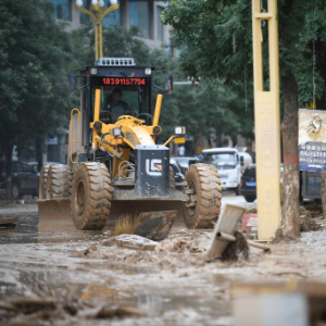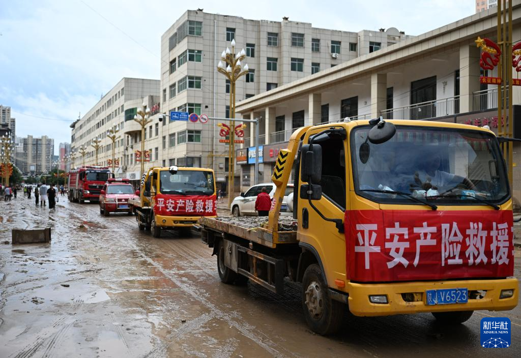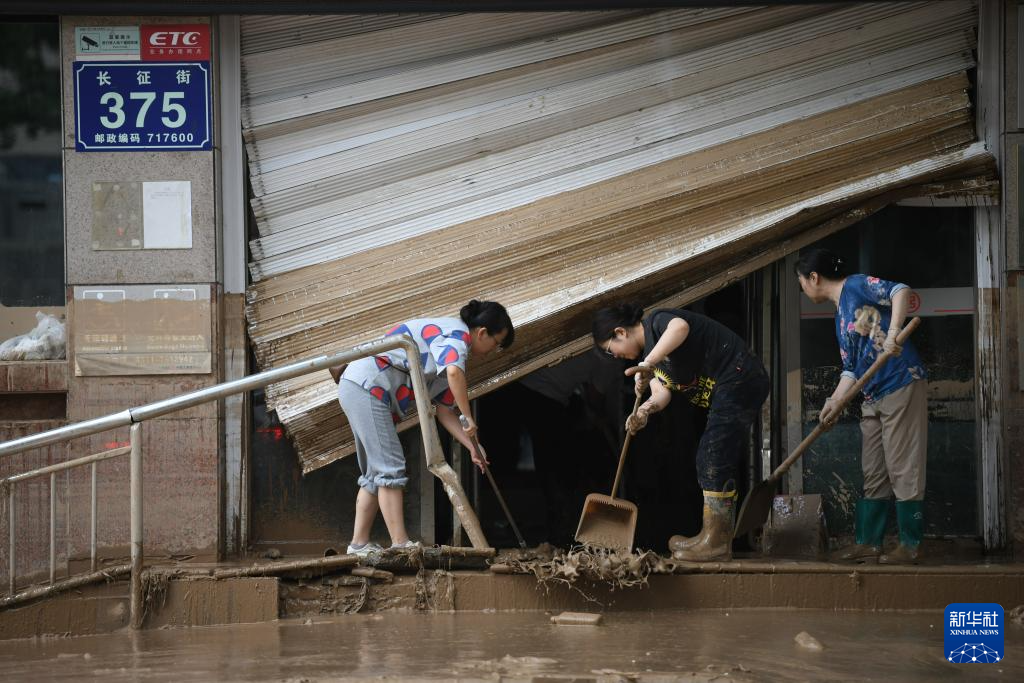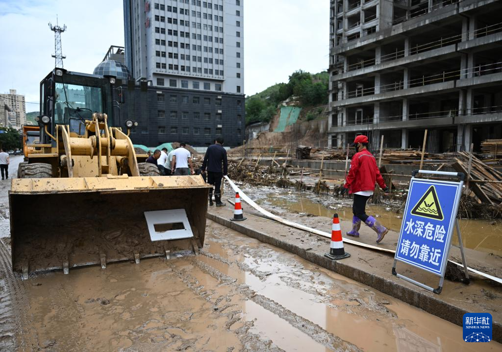 7月26日,救援车辆在吴起县街道进行清淤作业。
