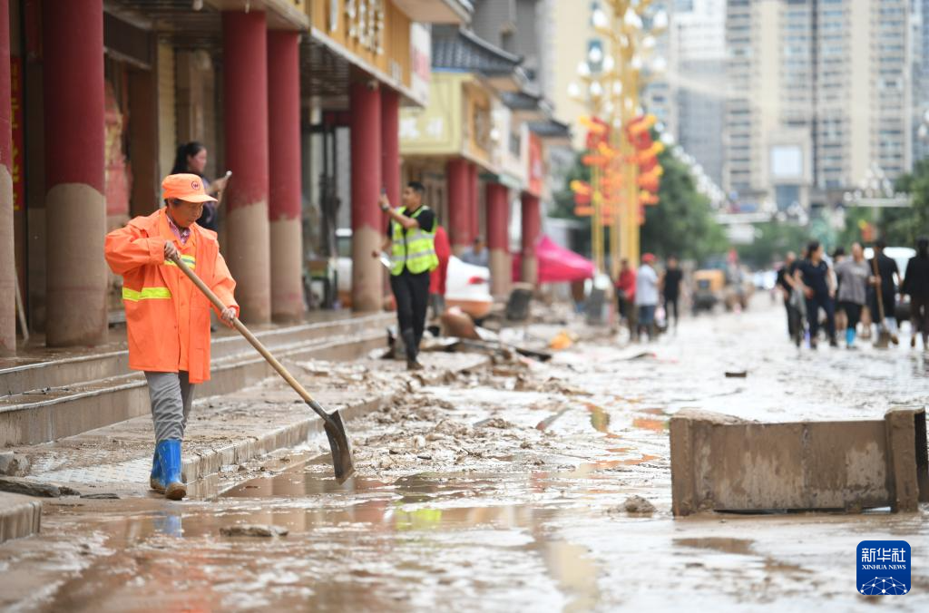 7月26日,保洁员在吴起县城清理路面淤泥。